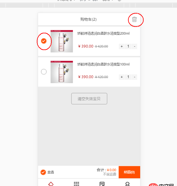 <p class='headerW'><p class='header'> 購(gòu)物車(2) <span ng-click='remove($index)'></span> <br clear='all'/></p> </p> <p class='mainbody'><ul> <li ng- ng-hide='x.li_hide' ng-repeat='x in products_mes'><p class='li_center'> <p ng-click='toggleC($index)'></p> <p class='goods_part'><p class='rightbox'> <p class='goods_content'>{{x.content}}</p> <p class='price_area'><span class='new_money'>{{x.newMoney}}</span><span class='old_money'>{{x.oldMoney}}</span><span class='conter'> <span class='remove_btn'>-</span><input type='number' class='' value='1'/><span class='add_btn'>+</span> <br clear='all'/></span> </p></p> </p> <br clear='all'/></p> </li><li ng-hide='sw'><p class='li_center'> <p class='select_btn'></p> <p class='lose'>失效</p> <p class='goods_part'><p class='rightbox'> <p class='goods_content'>嬌韻詩(shī)清透潤(rùn)白柔膚水清爽型200ml</p> <p class='price_area'><span class='new_money'>¥390.00</span><span class='old_money'>¥420.00</span><span class='conter'> <span class='remove_btn'>-</span><input type='number' class='' value='1'/><span class='add_btn'>+</span> <br clear='all'/></span> </p></p> </p> <br clear='all'/></p></li><script>var app=angular.module('myApp',[]);app.controller('myCon',function($scope){ $scope.sw=false;$scope.disappear=function(){ $scope.sw=true;};$scope.products_mes=[{onSw:false,content:'嬌韻詩(shī)清透潤(rùn)白柔膚水清爽型200ml',newMoney:'¥390.00',oldMoney:'¥420.00',products_img:'img/product.png' },{onSw:false,content:'嬌韻詩(shī)清透潤(rùn)白柔膚水清爽型100ml',newMoney:'¥390.00',oldMoney:'¥420.00',products_img:'img/product.png' }];$scope.products_mes.onSw=false;$scope.toggleC=function($index){$scope.products_mes[$index].onSw=!$scope.products_mes[$index].onSw;var index = $scope.products_mes.indexOf($index);if($scope.products_mes[$index].onSw){} }; $scope.delProds =[]; });