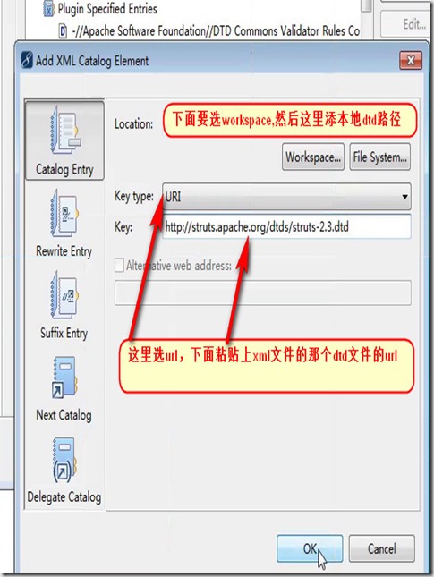 勾選 workspace --》選擇本地 dtd 文件的 Location ---》》Key type 選擇 URI