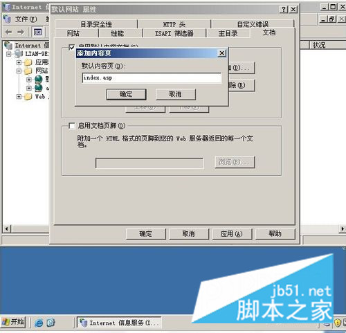 點擊文檔。把啟用默認內容文檔的都刪除,從新添加index.asp。之后其他就確定。完成。