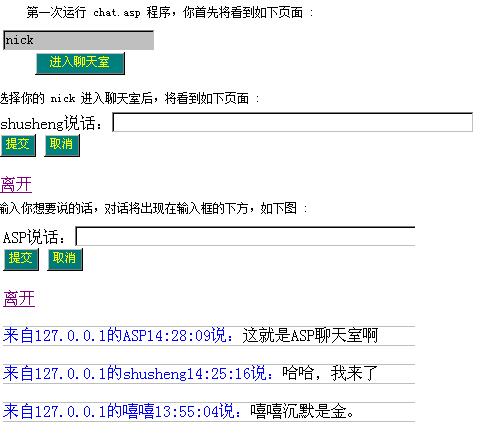 好了,我已經(jīng)將這個(gè) ASP Chat 程序的核心部分告訴大家了,剩下的一些細(xì)節(jié)性問(wèn)題請(qǐng)各位自己讀程序吧,其實(shí)這個(gè)程序還存在很多不足之處,最大的毛病是我沒(méi)有寫(xiě)自動(dòng)刷新的功能,因此如果你在Chat 中不說(shuō)話(huà),那也就看不到其他客戶(hù)所說(shuō)的話(huà)了。