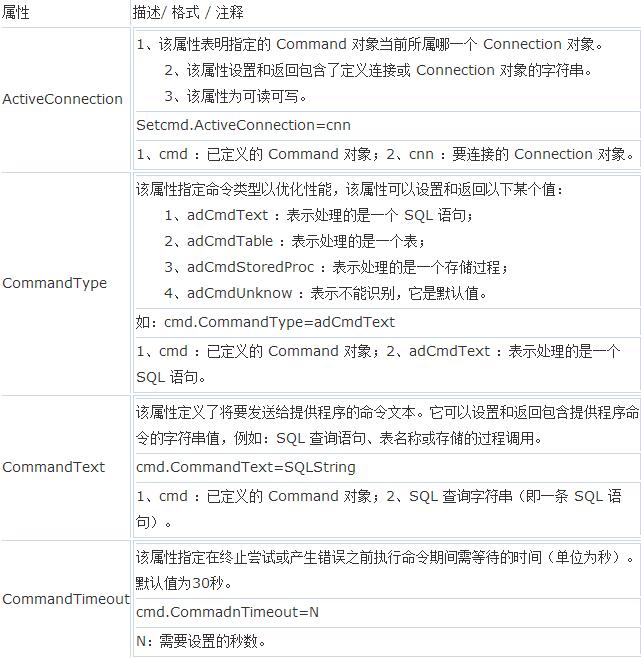 Coonamd 對象定義了將對數據源執行的命令,可以用于查詢數據庫表并返回一個記錄集,也可以用于對數據庫表進行添加、更改和刪除操作。