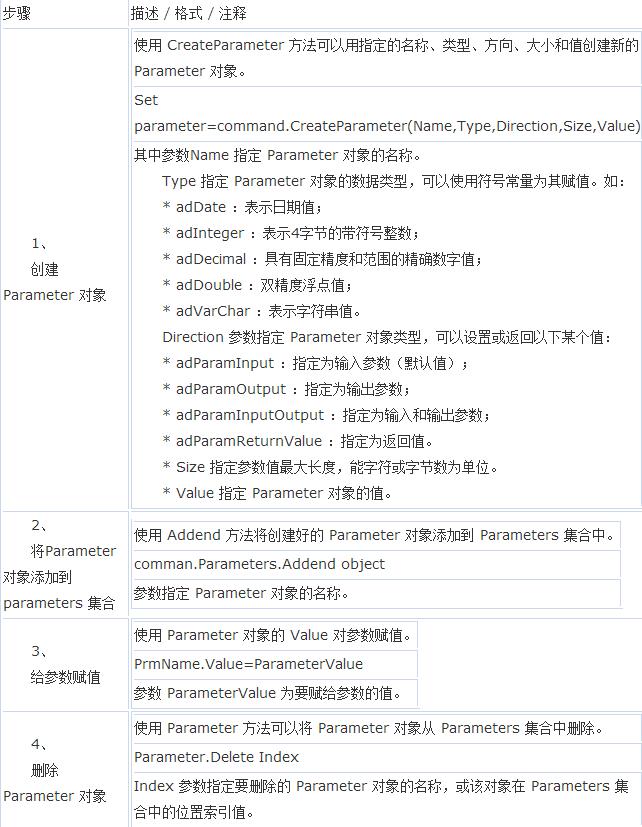 Command 對象具有由 Parameter 對象組成的 Parameters 集合,Parameter 對象代表與基于參數化查詢或存儲過程的 Command 對象相關聯的參數或自變量。通過創建 Parameter 對象并添加到 Parameter 集合中,可以向參數化查詢傳遞所需要的數據。使用 Parameter 集合的步驟如表下: