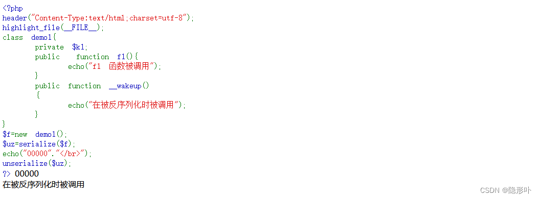<?phpheader("Content-Type:text/html;charset=utf-8");highlight_file(__FILE__);class demo1{ private $k1; public function f1(){echo("f1 函數被調用"); } public function __wakeup() {echo("在被反序列化時被調用"); }}$f=new demo1();$uz=serialize($f);echo("00000"."</br>");unserialize($uz);?>輸出結果