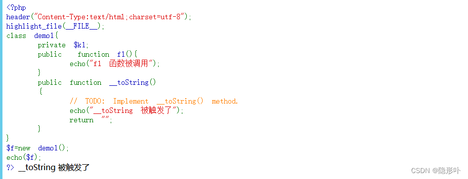 <?phpheader("Content-Type:text/html;charset=utf-8");highlight_file(__FILE__);class demo1{ private $k1; public function f1(){echo("f1 函數被調用"); } public function __toString() {echo("__toString 被觸發了");return ""; }}$f=new demo1();echo($f);?>輸出結果
