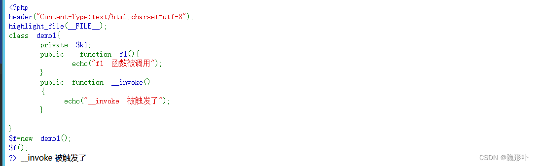 <?phpheader("Content-Type:text/html;charset=utf-8");highlight_file(__FILE__);class demo1{ private $k1; public function f1(){echo("f1 函數被調用"); } public function __invoke() { echo("__invoke 被觸發了"); }}$f=new demo1();$f();?>輸出結果