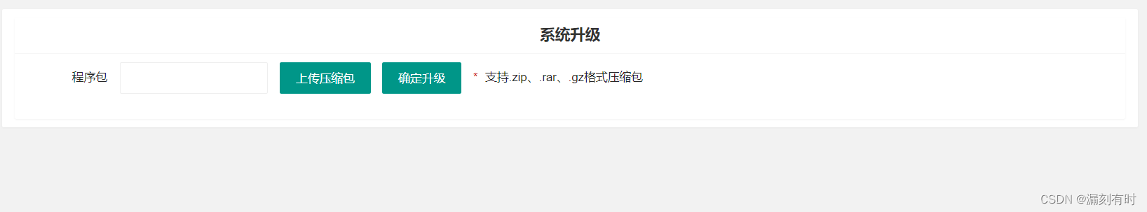 <form lay-filter="component-form-group"><div> <div>系統(tǒng)升級(jí)</div> <div><div> <label for="zip_url">程序包</label> <div><input type="text" id="zip_url" name="zip_url" lay-verify="required" readonly></div> <div><button type="button" id="uploadImg">上傳壓縮包</button></div> <div> <a lay-filter="save" id="L_add" lay-submit="">確定升級(jí)</a></div> <div><span>*</span> 支持.zip、.rar、.gz格式壓縮包</div></div> </div></div> </form>