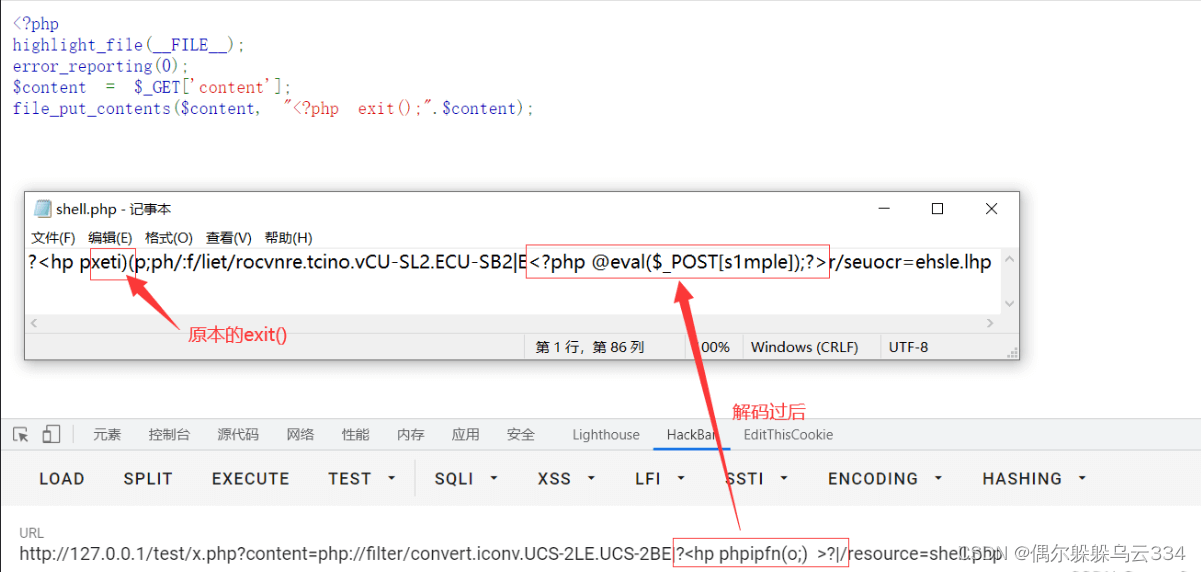 總結:我們的思路其實都是相同的,通過某一個手段把exit繞過,然后執行我們的命令,其實就是用一些編碼的特性,base64 rot13 usc-2 usc-4,都會把exit變成別的亂碼一般。