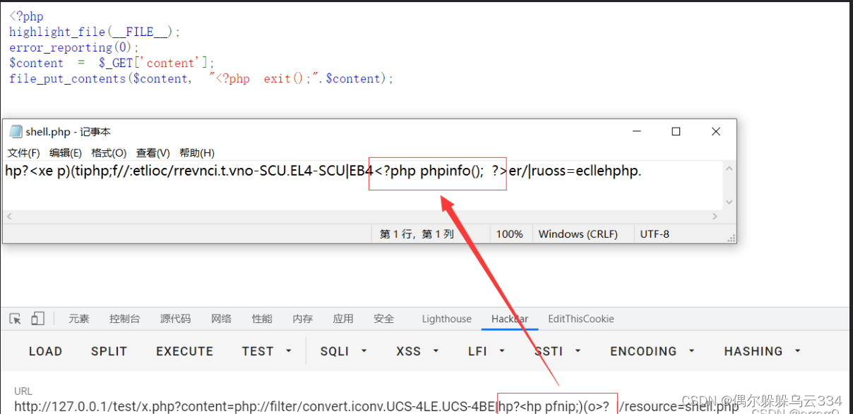 這道題,可控點有兩個 filename 和 content,先直接給出payload ,然后解析