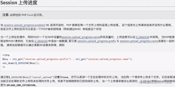 首先我們要先學習什么是session.upload_progress,可以簡單理解為文件上傳進度,在php官方文檔里可以找到描述: