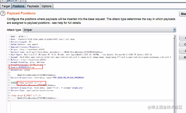 所以這里需要我們文件競爭不斷發(fā)包直至上傳成功,之后再讀取session文件所在路徑即可。類似于下圖,可以搭配burpsuite使用: