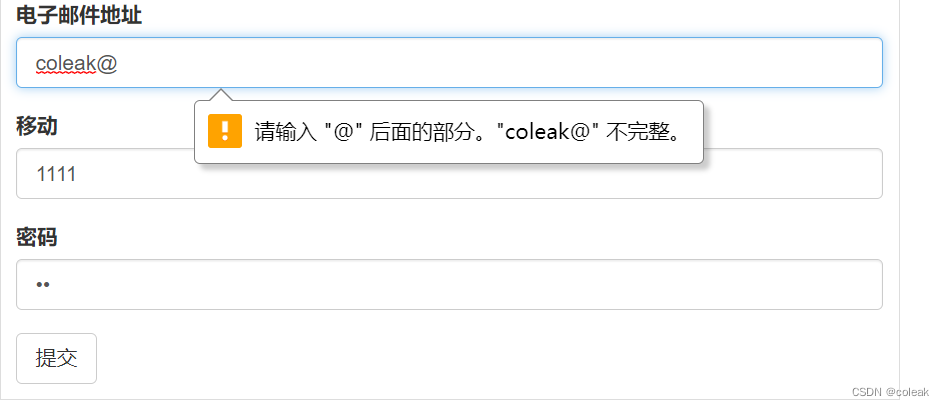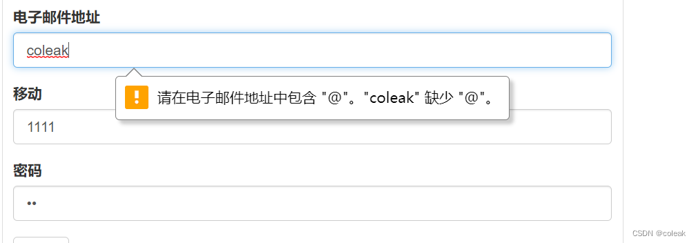 采取css模板實(shí)現(xiàn)了通過(guò)提交郵箱、手機(jī)號(hào)和密碼進(jìn)行登錄的功能,此時(shí)前端通過(guò)type類型先對(duì)郵箱進(jìn)行簡(jiǎn)單處理,發(fā)現(xiàn)需要輸入@以及@后必須有內(nèi)容,如圖