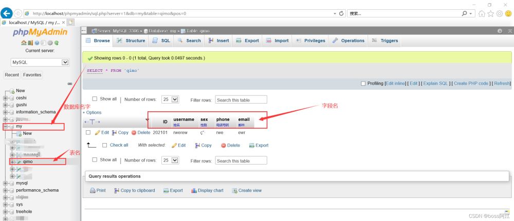 3.在數(shù)據(jù)庫里面創(chuàng)建好名為“my”的數(shù)據(jù)庫,并且建立 名為 qimo 的表,表里面含有字段名有 ID、username、sex、phone、email 等5個
