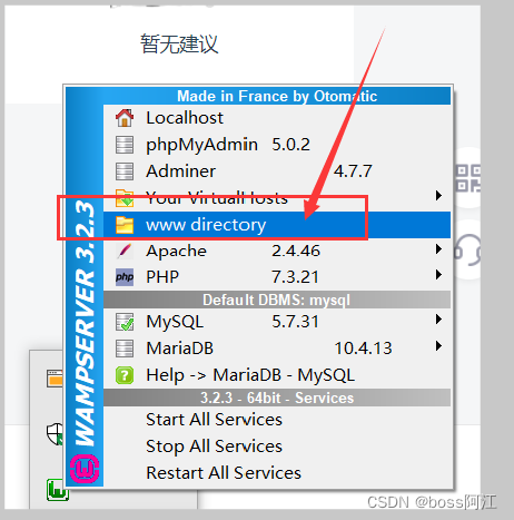 在安裝的Wampserver64軟件路徑下 找到 名字為 “www”的文件夾,所有php文件必須寫在此文件夾下才能正常運行,如 找不到 www 文件夾 ,可以按照下列方式打開: