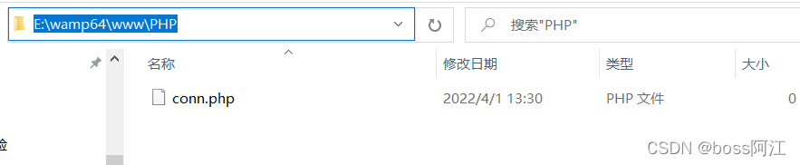 進入www文件夾后,新建一個PHP的文件夾(不新建也可以直接在www文件下寫php文件),然后在新建的PHP文件夾下建立一個PHP文件,這里命名為 conn.php。(conn.php的路徑是 www\PHP\conn.php 一定要在www文件夾里面)