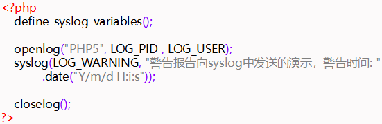 define_syslog_variables();//為系統日志初始化配置 ?? ?openlog();?? ??? ? ? ? //打開一個日志鏈接 ??syslog();?? ??? ? ? ? //發送一條日志記錄 ?? ?closelog();?? ? ? ?? ? ? ? //關閉日志鏈接