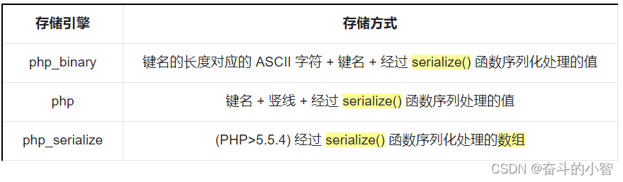 在PHP中Session有三種序列化的方式,分別是php,php_serialize,php_binary,不同的引擎所對應的Session的存儲的方式不同