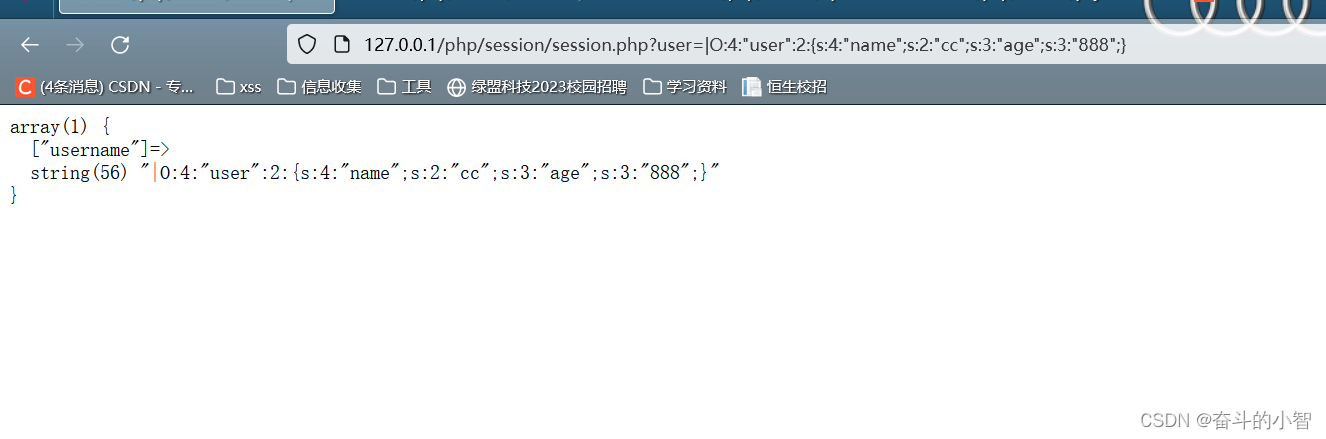 <?phperror_reporting(0);ini_set("session.serialize_handler","php_serialize");session_start();$_SESSION["username"] = $_GET["user"];echo "<pre>";var_dump($_SESSION);echo "</pre>";?>session2.php