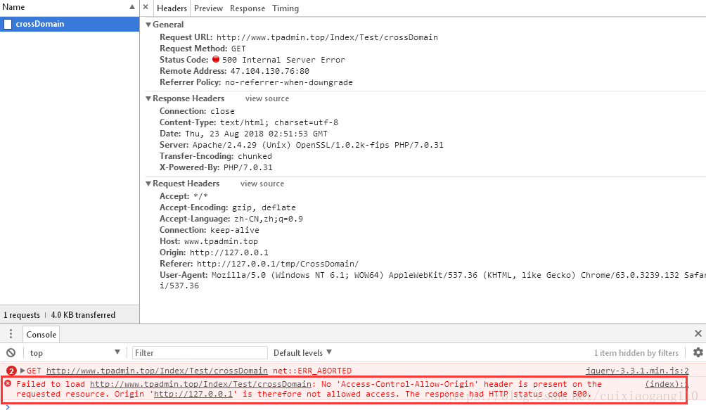 $("#demo1").click(function(){ $.ajax({url : "http://www.tpadmin.top/Index/Test/crossDomain",data : {},type : "get",success : function (res) { //No "Access-Control-Allow-Origin" header is present on the requested resource. Origin "http://127.0.0.1" is therefore not allowed access. 在執行時候報出的錯誤,這代表了跨域錯誤 alert(res);} });});?