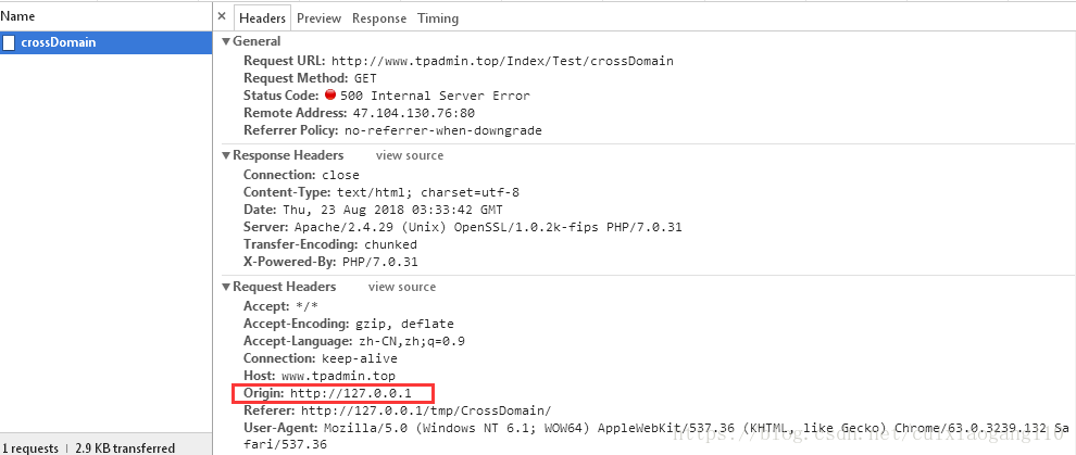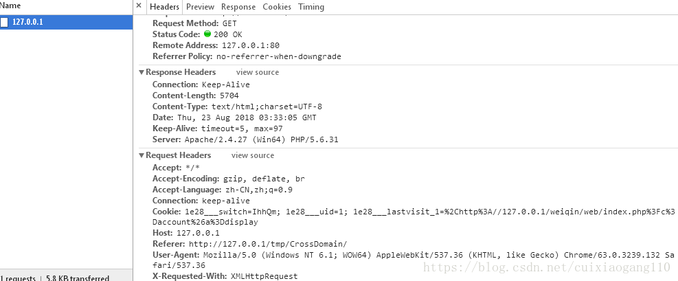 <?php$requestHeader = getallheaders();$origin = isset($requestHeader["Origin"])?$requestHeader["Origin"]:"";switch ($origin) { case "http://127.0.0.1":header("Access-Control-Allow-Origin:http://127.0.0.1");break; case "http://localhost":header("Access-Control-Allow-Origin:http://localhost");break; default:break;}$arr = ["code" => 200, "name" => "cui"];echo $data = json_encode($arr);//注意,不支持下面這種寫法//header("Access-Control-Allow-Origin:http://localhost,http://127.0.0.1");?>或者直接寫成(很不安全,不推薦這么寫)