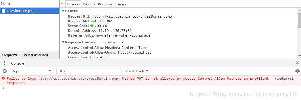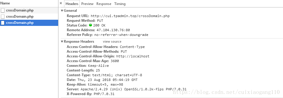 <?phpheader("Access-Control-Allow-Headers:Content-Type");header("Access-Control-Allow-Methods:PUT");//看這里header("Access-Control-Max-Age:3600");$requestHeader = getallheaders();$origin = isset($requestHeader["Origin"])?$requestHeader["Origin"]:"";switch ($origin) { case "http://127.0.0.1":header("Access-Control-Allow-Origin:http://127.0.0.1");break; case "http://localhost":header("Access-Control-Allow-Origin:http://localhost");break; default:break;}$arr = ["code" => 200, "name" => "cui"];echo $data = json_encode($arr);?>