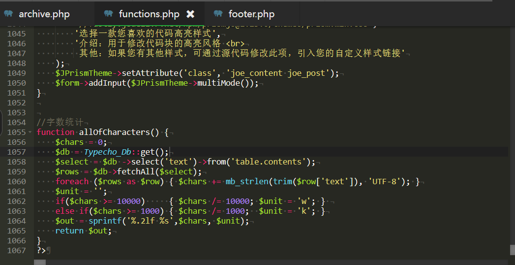 //字數統計function allOfCharacters() { $chars = 0; $db = Typecho_Db::get(); $select = $db ->select("text")->from("table.contents"); $rows = $db->fetchAll($select); foreach ($rows as $row) { $chars += mb_strlen(trim($row["text"]), "UTF-8"); } $unit = ""; if($chars >= 10000) { $chars /= 10000; $unit = "w"; } else if($chars >= 1000) { $chars /= 1000; $unit = "k"; } $out = sprintf("%.2lf %s",$chars, $unit); return $out;}joe主題