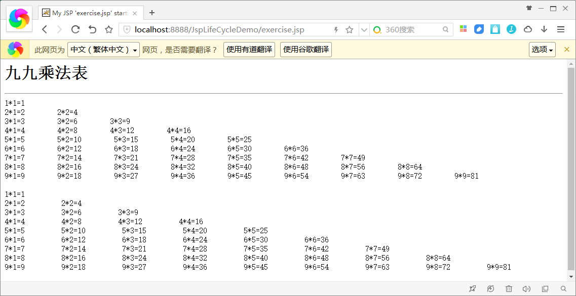 <%@ page language="java" import="java.util.*" contentType="text/html; charset=utf-8"%><%String path = request.getContextPath();String basePath = request.getScheme()+"://"+request.getServerName()+":"+request.getServerPort()+path+"/";%> <!DOCTYPE HTML PUBLIC "-//W3C//DTD HTML 4.01 Transitional//EN"><html> <head> <base href="<%=basePath%>" rel="external nofollow" > <title>My JSP "exercise.jsp" starting page</title> <meta http-equiv="pragma" content="no-cache"> <meta http-equiv="cache-control" content="no-cache"> <meta http-equiv="expires" content="0"> <meta http-equiv="keywords" content="keyword1,keyword2,keyword3"> <meta http-equiv="description" content="This is my page"> <!-- <link rel="stylesheet" type="text/css" href="styles.css" rel="external nofollow" > --> </head> <body> <%! //返回九九乘法表對(duì)應(yīng)的HTML代碼,通過表達(dá)式來(lái)調(diào)用,在頁(yè)面上顯示 String printMultiTable1() { String s = ""; for(int i=1;i<=9;i++) { for(int j=1;j<=i;j++) {s+=i+"*"+j+"="+(i*j)+" "; } s+="<br>"; //追加換行標(biāo)簽 } return s; } //JSP內(nèi)置out對(duì)象,使用腳本方式調(diào)用,打印九九乘法表 void printMultiTable2(JspWriter out) throws Exception { for(int i=1;i<=9;i++) { for(int j=1;j<=i;j++) {out.println(i+"*"+j+"="+(i*j)+" "); } out.println("<br>"); //追加換行標(biāo)簽 } } %> <h1>九九乘法表</h1> <hr> <%=printMultiTable1()%> <br> <% printMultiTable2(out);%> <br> </body></html>二 運(yùn)行效果