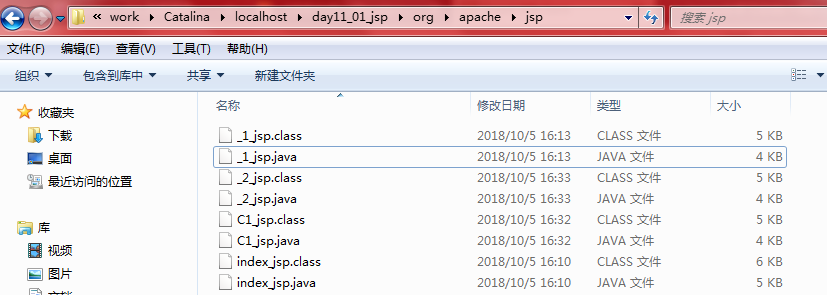 <%@ page language="java" contentType="text/html; charset=UTF-8" pageEncoding="UTF-8"%><!DOCTYPE html PUBLIC "-//W3C//DTD HTML 4.01 Transitional//EN" "http://www.w3.org/TR/html4/loose.dtd"><html><head><meta http-equiv="Content-Type" content="text/html; charset=ISO-8859-1"><title>Insert title here</title></head><body> This is my first JSP <% out.print("你好啊C1"); %></body></html>當我們通過瀏覽器(http://localhost:8080/day11_01_jsp(項目名稱)/C1.jsp)訪問C1.jsp時,服務器首先將C1.jsp翻譯成一個C1_jsp.class,在Tomcat服務器的work\Catalina\localhost\項目名\org\apache\jsp目錄下可以看到C1_jsp.class的源代碼。(1.jsp翻譯成_1_jsp.class)