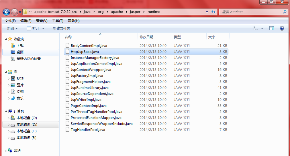 /* * Generated by the Jasper component of Apache Tomcat * Version: Apache Tomcat/7.0.52 * Generated at: 2018-10-05 08:32:50 UTC * Note: The last modified time of this file was set to * the last modified time of the source file after * generation to assist with modification tracking. */package org.apache.jsp;import javax.servlet.*;import javax.servlet.http.*;import javax.servlet.jsp.*;public final class C1_jsp extends org.apache.jasper.runtime.HttpJspBase implements org.apache.jasper.runtime.JspSourceDependent { private static final javax.servlet.jsp.JspFactory _jspxFactory = javax.servlet.jsp.JspFactory.getDefaultFactory(); private static java.util.Map<java.lang.String,java.lang.Long> _jspx_dependants; private javax.el.ExpressionFactory _el_expressionfactory; private org.apache.tomcat.InstanceManager _jsp_instancemanager; public java.util.Map<java.lang.String,java.lang.Long> getDependants() { return _jspx_dependants; } public void _jspInit() { _el_expressionfactory = _jspxFactory.getJspApplicationContext(getServletConfig().getServletContext()).getExpressionFactory(); _jsp_instancemanager = org.apache.jasper.runtime.InstanceManagerFactory.getInstanceManager(getServletConfig()); } public void _jspDestroy() { } public void _jspService(final javax.servlet.http.HttpServletRequest request, final javax.servlet.http.HttpServletResponse response) throws java.io.IOException, javax.servlet.ServletException { final javax.servlet.jsp.PageContext pageContext; javax.servlet.http.HttpSession session = null; final javax.servlet.ServletContext application; final javax.servlet.ServletConfig config; javax.servlet.jsp.JspWriter out = null; final java.lang.Object page = this; javax.servlet.jsp.JspWriter _jspx_out = null; javax.servlet.jsp.PageContext _jspx_page_context = null; try { response.setContentType("text/html; charset=UTF-8"); pageContext = _jspxFactory.getPageContext(this, request, response, null, true, 8192, true); _jspx_page_context = pageContext; application = pageContext.getServletContext(); config = pageContext.getServletConfig(); session = pageContext.getSession(); out = pageContext.getOut(); _jspx_out = out; out.write("\r\n"); out.write("<!DOCTYPE html PUBLIC \"-//W3C//DTD HTML 4.01 Transitional//EN\" \"http://www.w3.org/TR/html4/loose.dtd\">\r\n"); out.write("<html>\r\n"); out.write("<head>\r\n"); out.write("<meta http-equiv=\"Content-Type\" content=\"text/html; charset=ISO-8859-1\">\r\n"); out.write("<title>Insert title here</title>\r\n"); out.write("</head>\r\n"); out.write("<body>\r\n"); out.write("\tThis is my first JSP \r\n"); out.write("\t"); out.print("你好啊C1"); out.write("\r\n"); out.write("</body>\r\n"); out.write("</html>"); } catch (java.lang.Throwable t) { if (!(t instanceof javax.servlet.jsp.SkipPageException)){ out = _jspx_out; if (out != null && out.getBufferSize() != 0) try { out.clearBuffer(); } catch (java.io.IOException e) {} if (_jspx_page_context != null) _jspx_page_context.handlePageException(t); else throw new ServletException(t); } } finally { _jspxFactory.releasePageContext(_jspx_page_context); } }}我們可以看到,C1_jsp這個類是繼承 org.apache.jasper.runtime.HttpJspBase這個類的,通過查看Tomcat服務器的源代碼,可以知道在apache-tomcat-6.0.20-src\java\org\apache\jasper\runtime目錄下存HttpJspBase這個類的源代碼文件,如下圖所示: