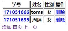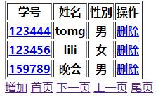 <%@page import="java.util.List"%><%@page import="org.ThreeLayer.Entity.Student"%><%@page import="org.ThreeLayer.Entity.Page_S"%><%@ page language="java" contentType="text/html; charset=UTF-8" pageEncoding="UTF-8"%><!DOCTYPE html><html><head><meta charset="UTF-8"><title>學生信息管理</title></head><body> <table border=1px> <tr> <th>學號</th> <th>姓名</th> <th>性別</th> <th>操作</th> </tr> <% Page_S pagg=(Page_S)request.getAttribute("pag"); for(Student student:pagg.getStudents()) { %> <tr> <th><a href="FindStudentById_Servlet?uid=<%=student.getId()%>" ><%=student.getId() %></a></th> <th><%=student.getName() %></th> <th><%=student.getSex() %></th> <th><a href="DeleteStudent_Servlet?uid=<%=student.getId()%>" >刪除</a></th> </tr> <% } %> </table> <a href="add.jsp" >增加</a> <% if(pagg.getCurrentPage()==0)//用戶位于首頁的時候 { %> <a href="findStudentByPage?currentPage=<%=pagg.getCurrentPage()+1%>" >下一頁</a> <a href="findStudentByPage?currentPage=<%=pagg.getTotalPage()-1%>" >尾頁</a> <% }else if(pagg.getCurrentPage()==pagg.getTotalPage()-1)//用戶位于尾頁的時候 { %> <a href="findStudentByPage?currentPage=0" >首頁</a> <a href="findStudentByPage?currentPage=<%=pagg.getCurrentPage()-1%>" >上一頁</a> <% }else//用戶位于中間頁面的時候 { %> <a href="findStudentByPage?currentPage=0" >首頁</a> <a href="findStudentByPage?currentPage=<%=pagg.getCurrentPage()+1%>" >下一頁</a> <a href="findStudentByPage?currentPage=<%=pagg.getCurrentPage()-1%>" >上一頁</a> <a href="findStudentByPage?currentPage=<%=pagg.getTotalPage()-1%>" >尾頁</a> <% } %> <br></body></html>看一下效果圖: