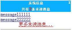 <%@ page language="java" import="java.util.*" pageEncoding="gb2312"%><%@page import="java.util.*"%><html> <head> <style type="text/css"> #winpop { width:250px; height:0px; position:absolute; right:0; bottom:0; border:1px solid grey; margin:0; padding:1px; overflow:hidden; display:none; background:#FFFFFF} #winpop .title { width:100%; height:20px; line-height:20px; background:#0AB0FF ; font-weight:bold; text-align:center; font-size:12px;color:white} #winpop .con { width:100%; height:360px; line-height:80px; font-weight:bold; font-size:12px; color:#FF0000; text-decoration:underline; text-align:center} .close { position:absolute; right:4px; top:-1px; color:#FFFFFF; cursor:pointer} </style> </head><% //未讀消息unreadList根據(jù)實際情況取 List<Map> unreadList = new ArrayList<Map>(); Map<String,String> map1=new HashMap<String,String>(); map1.put("msgId","1"); map1.put("msgContent","message111111"); unreadList.add(map1); Map<String,String> map2=new HashMap<String,String>(); map2.put("msgId","2"); map2.put("msgContent","message222222"); unreadList.add(map2); int num=unreadList.size();%> <body> <script language="javascript" type="text/javascript"> window.onload = function tanchuang() { //加載 document.getElementById("winpop").style.height = "0px";//要初始化這個高度,雖然CSS里已經初始化了 setTimeout("tips_pop()",0); //調用tips_pop()這個函數(shù) } function tips_pop() { var MsgPop = document.getElementById("winpop");//獲取窗口這個對象,即ID為winpop的對象 var popH = parseInt(MsgPop.style.height);//用parseInt將對象的高度轉化為數(shù)字,以方便下面比較 if (popH == 0) { //如果窗口的高度是0 MsgPop.style.display = "block";//那么將隱藏的窗口顯示出來 show = setInterval("changeH("up")", 2);//開始以每0.002秒調用函數(shù)changeH("up"),即每0.002秒向上移動一次 } else { //否則 hide = setInterval("changeH("down")", 2);//開始以每0.002秒調用函數(shù)changeH("down"),即每0.002秒向下移動一次 } } function changeH(str) { var MsgPop = document.getElementById("winpop"); var popH = parseInt(MsgPop.style.height); if (str == "up") { //如果這個參數(shù)是UP if (popH <= 100) { //如果轉化為數(shù)值的高度小于等于100 MsgPop.style.height = (popH + 4).toString() + "px";//高度增加4個象素 } else { clearInterval(show);//否則就取消這個函數(shù)調用,意思就是如果高度超過100象度了,就不再增長了 } } if (str == "down") { if (popH >= 4) { //如果這個參數(shù)是down MsgPop.style.height = (popH - 4).toString() + "px";//那么窗口的高度減少4個象素 } else { //否則 clearInterval(hide); //否則就取消這個函數(shù)調用,意思就是如果高度小于4個象度的時候,就不再減了 MsgPop.style.display = "none"; //因為窗口有邊框,所以還是可以看見1~2象素沒縮進去,這時候就把DIV隱藏掉 } } } </script> <%if(num>0){ %> <div id="winpop"> <div >系統(tǒng)信息<br> 共有<font color="red"><big><%=num %></big></font>條未讀消息 <span οnclick="tips_pop()">X</span></div> <%for(int i=0;i<num;i++) { %> <!-- 點擊信息標題鏈接到信息明細,傳遞信息編號參數(shù) --> <a href="/XXXAction.do?msgId=<%=unreadList.get(i).get("msgId") %>"> <%if(String.valueOf(unreadList.get(i).get("msgContent")).length()>16) {%> <%=String.valueOf(unreadList.get(i).get("msgContent")).substring(0,16)+"..." %> <%} else{ %> <%=String.valueOf(unreadList.get(i).get("msgContent")) %> <%} %> </a><br> <% if(i>=1){//最多顯示兩條 break; } } %> <center> <!-- 點擊查看更多未讀消息 --> <a href="/XXXAction.do %>" ><font color="red">更多未讀消息...</font></a></center> </div> <%} %> </body></html>以上就是本文的全部內容,希望對大家的學習有所幫助,也希望大家多多支持。
