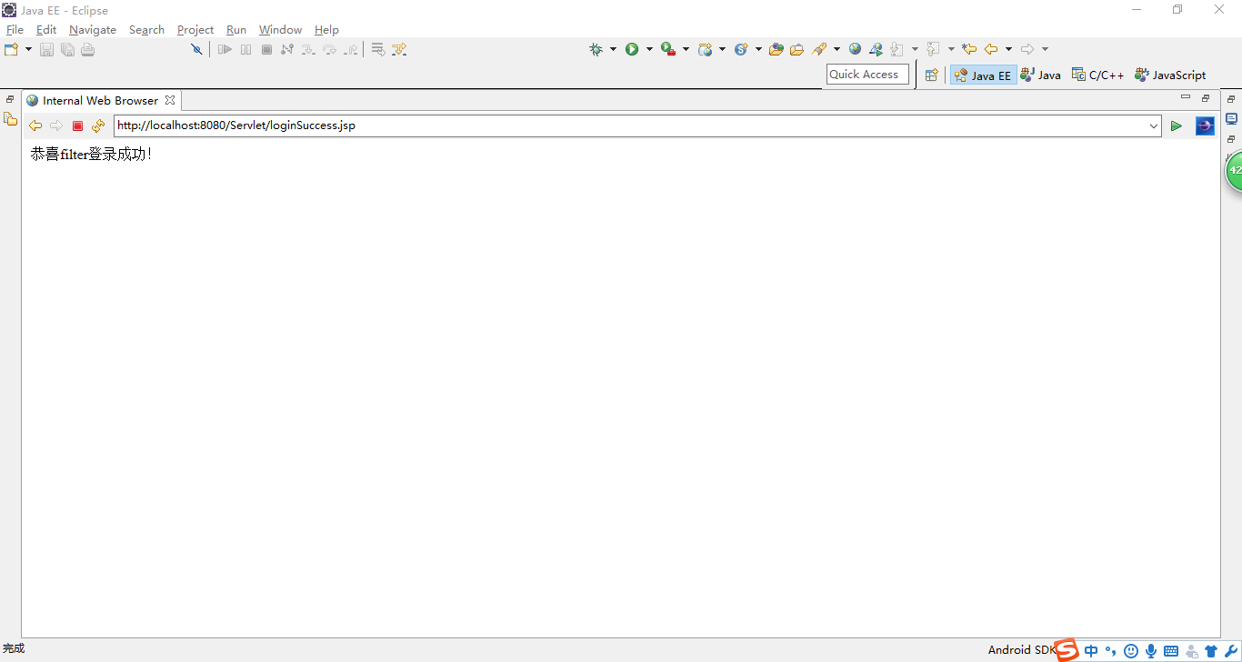 <%@page import="java.util.Date"%><%@ page language="java" contentType="text/html; charset=UTF-8" pageEncoding="UTF-8"%><!DOCTYPE html PUBLIC "-//W3C//DTD HTML 4.01 Transitional//EN" "http://www.w3.org/TR/html4/loose.dtd"><html><head><meta http-equiv="Content-Type" content="text/html; charset=UTF-8"><title>example</title></head><body> <% String username = (String) session.getAttribute("user"); %> 恭喜<%=username%>登錄成功!</body></html>6.在瀏覽器里面輸入http://localhost:8080/Servlet/login.jsp運行之后得到的結果如下所示: