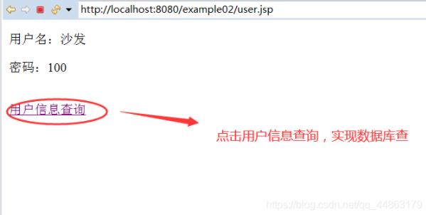 (2)實現查詢數據庫的功能。在登陸后的頁面中,顯示用戶名和密碼,并且設置有一個超鏈接,實現查詢數據庫的功能。