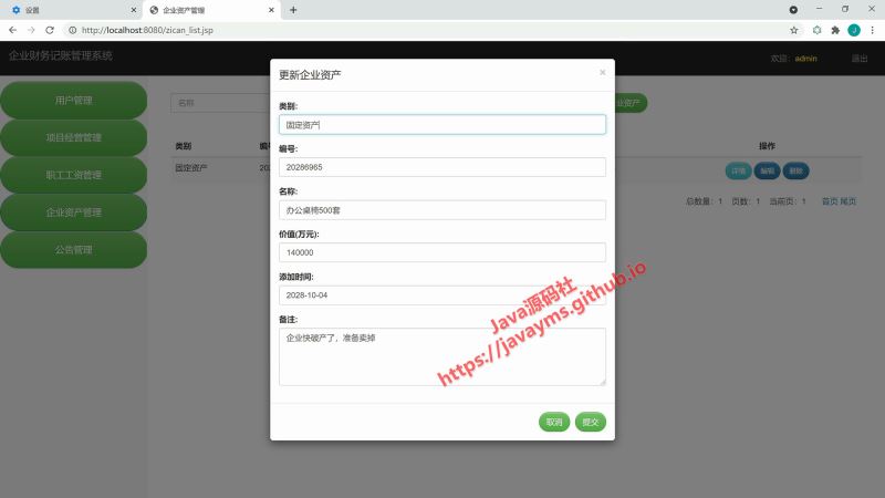 登錄、注冊、退出、用戶模塊、公告模塊、職工工資模塊、企業資產模塊、項目經營模塊的增刪改查管理