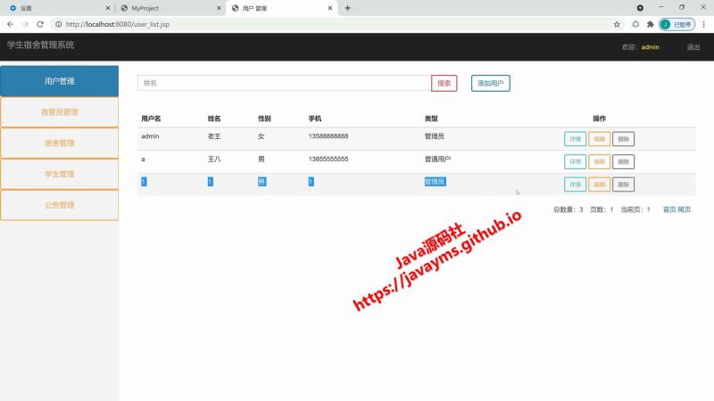登錄、注冊、退出、用戶模塊、公告模塊、宿管員模塊、宿舍模塊、學生模塊的增刪改查管理