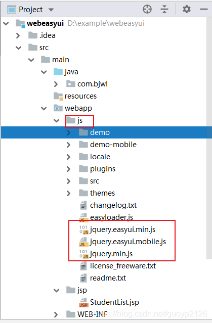 示例使用上一個項目:在webapp創建js目錄,將包解壓到此路徑下,如下圖