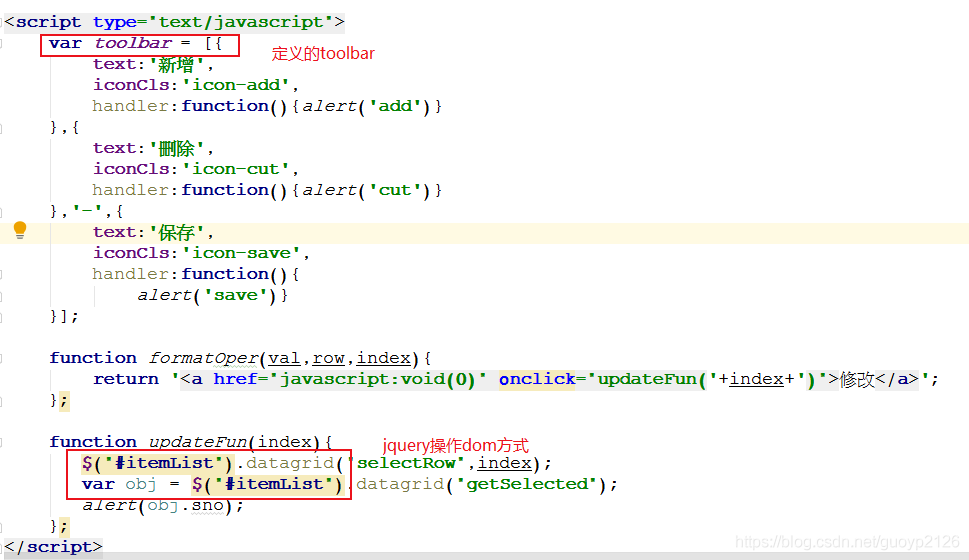 <%@ page contentType="text/html;charset=UTF-8" language="java" %><table id="itemList" title="學生列表" opts.striped="true" fitColumns="true" data-options="singleSelect:true,collapsible:true,url:"student",method:"post",toolbar:toolbar"> <thead> <tr><th data-options="field:"sno",width:80">學號</th><th data-options="field:"sName",width:100,align:"left"">姓名</th><th data-options="field:"sSex",width:100,align:"center"">性別</th><th data-options="field:"sAge",width:100,align:"right"">年齡</th><th data-options="field:"sDept",align:"left"">所在院系</th><th data-options="field:"operation",width:80,align:"center",formatter:formatOper">操作</th> </tr> </thead></table><script type="text/javascript"> var toolbar = [{text:"新增",iconCls:"icon-add",handler:function(){alert("add")} },{text:"刪除",iconCls:"icon-cut",handler:function(){alert("cut")} },"-",{text:"保存",iconCls:"icon-save",handler:function(){ alert("save")} }]; function formatOper(val,row,index){return "<a href="javascript:void(0)" rel="external nofollow" οnclick="updateFun("+index+")">修改</a>"; }; function updateFun(index){ $("#itemList").datagrid("selectRow",index); var obj = $("#itemList").datagrid("getSelected"); alert(obj.sno); };</script>這個jsp中的代碼并不是一個完整的jsp頁面,更類似一個div中的內容。關鍵代碼如下