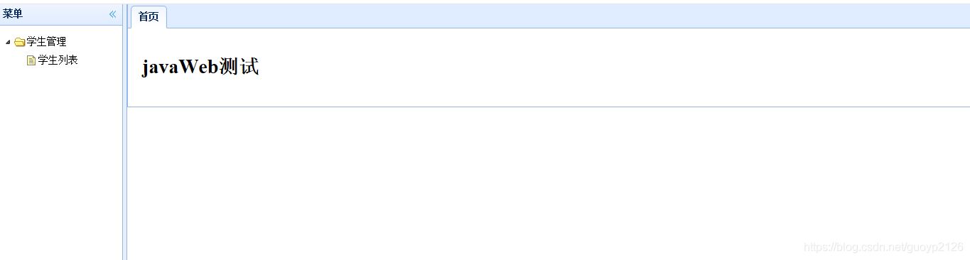 <%@ page contentType="text/html;charset=UTF-8" language="java" %><html><head> <meta charset="UTF-8"> <title>歡迎頁面</title> <link rel="stylesheet" type="text/css" href="js/themes/default/easyui.css" rel="external nofollow" > <link rel="stylesheet" type="text/css" href="js/themes/icon.css" rel="external nofollow" > <link rel="stylesheet" type="text/css" href="js/demo.css" rel="external nofollow" > <script type="text/javascript" src="js/jquery.min.js"></script> <script type="text/javascript" src="js/jquery.easyui.min.js"></script> <style type="text/css">.content { padding: 10px 10px 10px 10px;} </style></head><body><div data-options="region:"west",title:"菜單",split:true"> <ul id="menu"><li> <span>學生管理</span> <ul><li data-options="attributes:{"url":"student",method:"get"}">學生列表</li> </ul></li> </ul></div><div data-options="region:"center",title:"""> <div id="tabs"><div title="首頁"> <h1>javaWeb測試</h1></div> </div></div></body></html><script type="text/javascript"> $(function(){$("#menu").tree({ onClick: function(node){if($("#menu").tree("isLeaf",node.target)){ var tabs = $("#tabs"); var tab = tabs.tabs("getTab",node.text); if(tab){tabs.tabs("select",node.text); }else{tabs.tabs("add",{ title:node.text, href: node.attributes.url, closable:true, bodyCls:"content"}); }} }}); });</script>核心代碼說明: