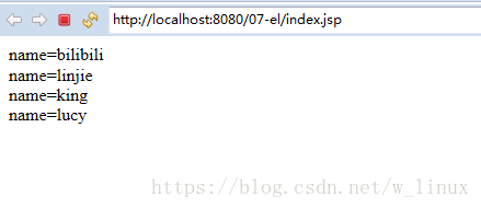 <%@ page language="java" contentType="text/html; charset=UTF-8" import="linjie.com.Demo" pageEncoding="UTF-8"%><!DOCTYPE html PUBLIC "-//W3C//DTD HTML 4.01 Transitional//EN" "http://www.w3.org/TR/html4/loose.dtd"><html><head><meta http-equiv="Content-Type" content="text/html; charset=UTF-8"><title>Insert title here</title></head><body> <% Demo test=new Demo("linjie",12); request.setAttribute("ELttt", test); %> name=${requestScope.ELttt.name }<br> age=${requestScope.ELttt.age }<br> <!-- 若訪問(wèn)為null的對(duì)象的屬性,EL是不會(huì)拋出空指針異常的,只是不顯示而已 --> names=${requestScope.ELtttxx.name }<br></body></html>客戶(hù)瀏覽器顯示結(jié)果