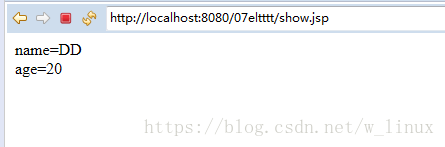 <%@page import="java.util.*"%><%@ page language="java" contentType="text/html; charset=UTF-8" pageEncoding="UTF-8"%><!DOCTYPE html PUBLIC "-//W3C//DTD HTML 4.01 Transitional//EN" "http://www.w3.org/TR/html4/loose.dtd"><html><head><meta http-equiv="Content-Type" content="text/html; charset=UTF-8"><title>Insert title here</title></head><body> <% Map<String,Object> map=new HashMap<String,Object>(); map.put("age", 20); map.put("name", "xlj"); pageContext.setAttribute("map", map); %> name=${map.name }<br> age=${map.age }<br></body></html>客戶(hù)瀏覽器顯示結(jié)果