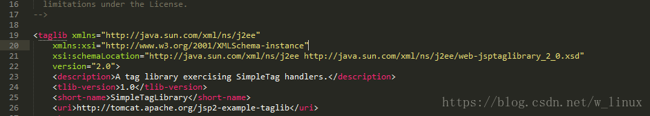 - 注冊(cè):先找到j(luò)sp2-example-taglib.tld,將頭部以及注冊(cè)函數(shù)復(fù)制到自己創(chuàng)建的.tld文件中(.tld放在WEB-INF下)