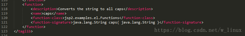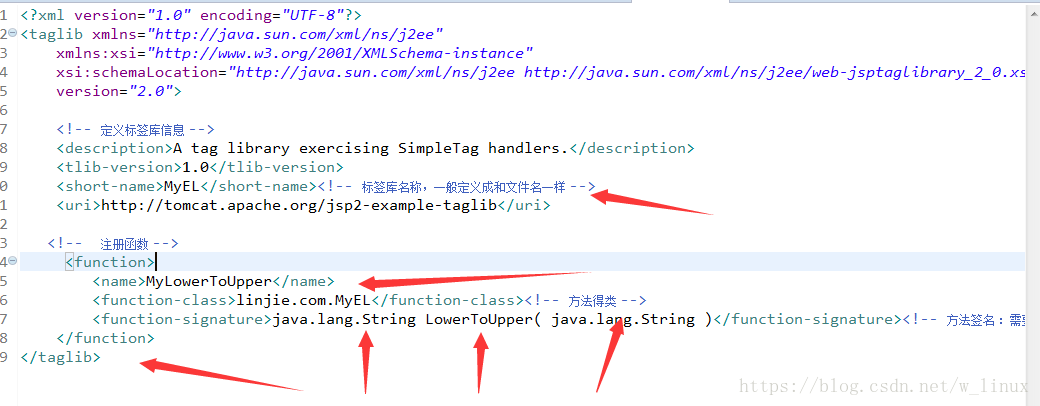 <?xml version="1.0" encoding="UTF-8"?><taglib xmlns="http://java.sun.com/xml/ns/j2ee" xmlns:xsi="http://www.w3.org/2001/XMLSchema-instance" xsi:schemaLocation="http://java.sun.com/xml/ns/j2ee http://java.sun.com/xml/ns/j2ee/web-jsptaglibrary_2_0.xsd" version="2.0"> <!-- 定義標(biāo)簽庫(kù)信息 --> <description>A tag library exercising SimpleTag handlers.</description> <tlib-version>1.0</tlib-version> <short-name>MyEL</short-name><!-- 標(biāo)簽庫(kù)名稱(chēng),一般定義成和文件名一樣 --> <uri>http://tomcat.apache.org/jsp2-example-taglib</uri> <!-- 注冊(cè)函數(shù) --> <function> <name>MyLowerToUpper</name> <function-class>linjie.com.MyEL</function-class><!-- 方法得類(lèi) --> <function-signature>java.lang.String LowerToUpper( java.lang.String )</function-signature><!-- 方法簽名 :需要返回值以及方法名、參數(shù)--> </function></taglib>