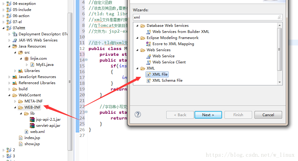 package linjie.com;//自定義函數(shù)//該類(lèi)及其函數(shù),需要在擴(kuò)展名為.tld的xml文件中注冊(cè)//tld:tag library definition(標(biāo)簽庫(kù)定義)//xml文件是需要約束的,即需要配置文件頭部。這個(gè)頭部約束可以從一下文件中進(jìn)行復(fù)制//在Tomcat安裝目錄下:webapps\examples\WEB-INF\jsp2//文件為:jsp2-example-taglib.tld//這個(gè).tld的xml文件,需要定義在當(dāng)前web項(xiàng)目的WEB-INF目錄下,在此目錄下創(chuàng)建以.tld結(jié)尾的xml文件//將jsp2-example-taglib.tld中頭部復(fù)制到創(chuàng)建的xml文件中//再將函數(shù)注冊(cè),還是在jsp2-example-taglib.tld底部中復(fù)制public class MyEL { private static MyEL instance; public static MyEL getInstance() { if(instance==null) { instance=new MyEL(); } return instance; } //字符串小寫(xiě)變大寫(xiě) public static String LowerToUpper(String str) { return str.toUpperCase(); }}2、將jsp2-example-taglib.tld中頭部部分以及底部的注冊(cè)函數(shù)部分復(fù)制到自己創(chuàng)建的tld(在WEB-INF下)文件中