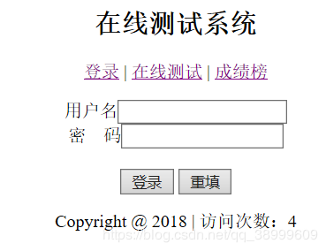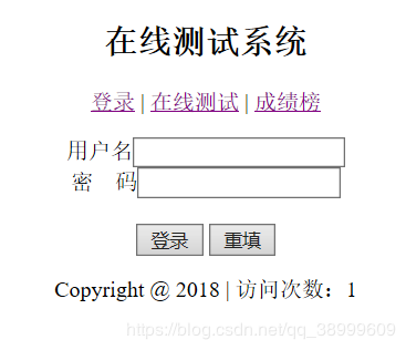 <center> <h2>在線測試系統</h2> <p> <a href="Index.jsp" rel="external nofollow" >登錄</a> | <a href="test.jsp" rel="external nofollow" >在線測試</a> | <a href="scorelist.jsp" rel="external nofollow" >成績榜</a> </p></center>