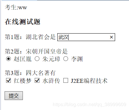 <%String username=(String)session.getAttribute("username"); if(username==null){ out.print("未登陸,3秒鐘后重新登錄"); response.setHeader("refresh", "3;url="Index.jsp"");}else{ %> 考生:<%=session.getAttribute("username") %> <h3>在線測試題</h3><form action="submit.jsp" onsubmit="return confirm("確定提交嗎?")"> 第1題:湖北省會是 <input type="text" name="q1" /> <br><br> 第2題:宋朝開國皇帝是 <br> <input type="radio" value="趙匡胤" name="q2"> 趙匡胤 <input type="radio" value="朱元璋" name="q2"> 朱元璋 <input type="radio" value="李淵" name="q2"> 李淵 <br><br> 第3題:四大名著有 <br> <input type="checkbox" value="紅樓夢" name="q3"> 紅樓夢 <input type="checkbox" value="水滸傳" name="q3"> 水滸傳 <input type="checkbox" value="J2EE編程技術" name="q3"> J2EE編程技術 <br><br> <button type="submit">提交</button></form> <%}%>進入頁面之前,會再次檢測用戶是否登錄,以防止用戶通過其他路徑訪問到該頁面。