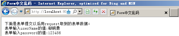 <%@ page language="java" import="java.util.*" contentType="text/html;charset=gb2312"%><html> <head> <title>Form中文亂碼</title> </head> <body> <font size="2"> 下面是表單提交以后用request取到的表單數據:<br> <% String userName = request.getParameter("userName"); String password = request.getParameter("password"); out.println("表單輸入userName的值:" + userName + "<br>"); out.println("表單輸入password的值:" + password + "<br>"); %> </font> </body></html>在上面的程序中,如果表單輸入沒有中文,則可以正常的顯示當輸入的數據中有中文的時候,得到的結果如圖所示。