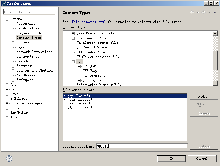 對于這個問題我們只需要更改一下Eclipse或者是MyEclipse中對JSP的默認編碼就可以了,修改的地方(我的MyEclipse版本為11)如圖所示