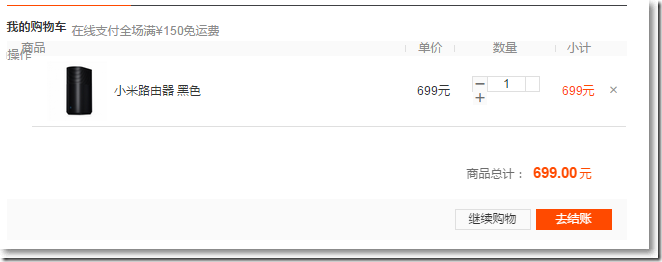 2、購物車內產品:數量可調整,對應的小計和總計動態變化。點擊移除按鈕移除該產品。