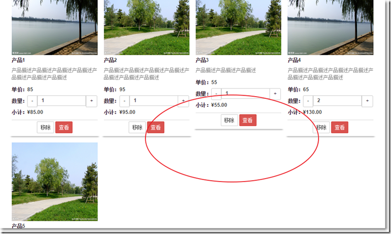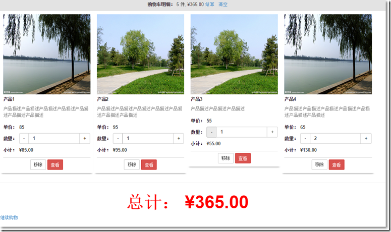 @model MvcApplication1.Models.CartIndexVm@{ ViewBag.Title = "CartIndex"; Layout = "~/Views/Shared/_Layout.cshtml";}@section styles{ <link href="~/Content/shopitem.css" rel="external nofollow" rel="stylesheet" /> <link href="~/Content/jquery.bootstrap-touchspin.min.css" rel="external nofollow" rel="stylesheet" />}<div> <div> @for (int i = 0; i < Model.Cart.Lines.Count(); i++) { var item = (Model.Cart.Lines.ToList())[i]; if (i != 0 && i%4 == 0) //每行有4個div { <div></div> } <div> <img src="@item.Product.ImageUrl"><div> <div>@item.Product.Name</div> <div>@item.Product.Description</div> <div><table> <tr><td>單價:</td><td>@item.Product.Price</td> </tr> <tr><td>數量:</td><td> <input type="text" value="@item.Quantity" name="demo2" /></td> </tr> <tr><td>小計:</td><td>@((item.Quantity * item.Product.Price).ToString("c"))</td> </tr></table> </div></div><div> <div>@using (Html.BeginForm("RemoveFromCart", "Home")){ @Html.Hidden("Id", item.Product.Id) @Html.HiddenFor(x => x.ReturnUrl) <input type="submit" value="移除"/> <a href="#" rel="external nofollow" role="button">查看</a>} </div></div> </div> } </div></div><hr/><div> <div><div> <span>總計:</span> @Model.Cart.ComputeTotalPrice().ToString("c")</div><p align="left"> <a href="@Model.ReturnUrl" rel="external nofollow" >繼續購物</a></p> </div></div>@section scripts{ <script src="~/Scripts/jquery.bootstrap-touchspin.min.js"></script> <script type="text/javascript">$(function () { var i = $("input[class="demo2"]"); i.TouchSpin({min: 1,max: 100,step: 1//增量或減量 }); i.on("touchspin.on.stopupspin", function () {$.post("@Url.Action("IncreaseOrDecreaseOne", "Home")", { "id": $(this).closest("div.productbox").find("#Id").val(), "quantity": $(this).val() }, function (data) { if (data.msg) {location.reload(); }});//var temp = $(this).val();//alert(temp);//var temp = $(this).closest("div.productbox").find("#Id").val();//alert(temp); }); i.on("touchspin.on.stopdownspin", function () {$.post("@Url.Action("IncreaseOrDecreaseOne", "Home")", { "id": $(this).closest("div.productbox").find("#Id").val(), "quantity": $(this).val() }, function (data) { if (data.msg) {location.reload(); }}); });}); </script>}在購物車頁,用了Bootstrap TouchSpin這款插件,點擊其中的數量的增量和減量按鈕,就向Home控制器中的IncreaseOrDecreaseOne方法發送一個異步post請求,得到返回數據刷新購物車頁。