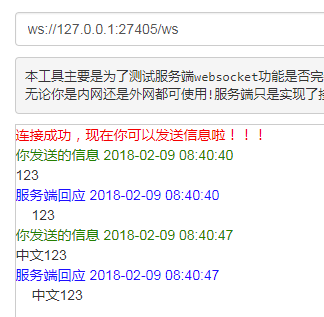 async Task Echo(HttpContext context, WebSocket webSocket){ var buffer = new byte[1024 * 4]; WebSocketReceiveResult result = await webSocket.ReceiveAsync(new ArraySegment<byte>(buffer), CancellationToken.None); while (!result.CloseStatus.HasValue) {await webSocket.SendAsync(new ArraySegment<byte>(buffer, 0, result.Count), result.MessageType, result.EndOfMessage, CancellationToken.None);result = await webSocket.ReceiveAsync(new ArraySegment<byte>(buffer), CancellationToken.None); } await webSocket.CloseAsync(result.CloseStatus.Value, result.CloseStatusDescription, CancellationToken.None);}到此一個簡單的websocket應用就完成了,我們可以隨便找一個測試webscoket的程序或在線網頁測試一下了。